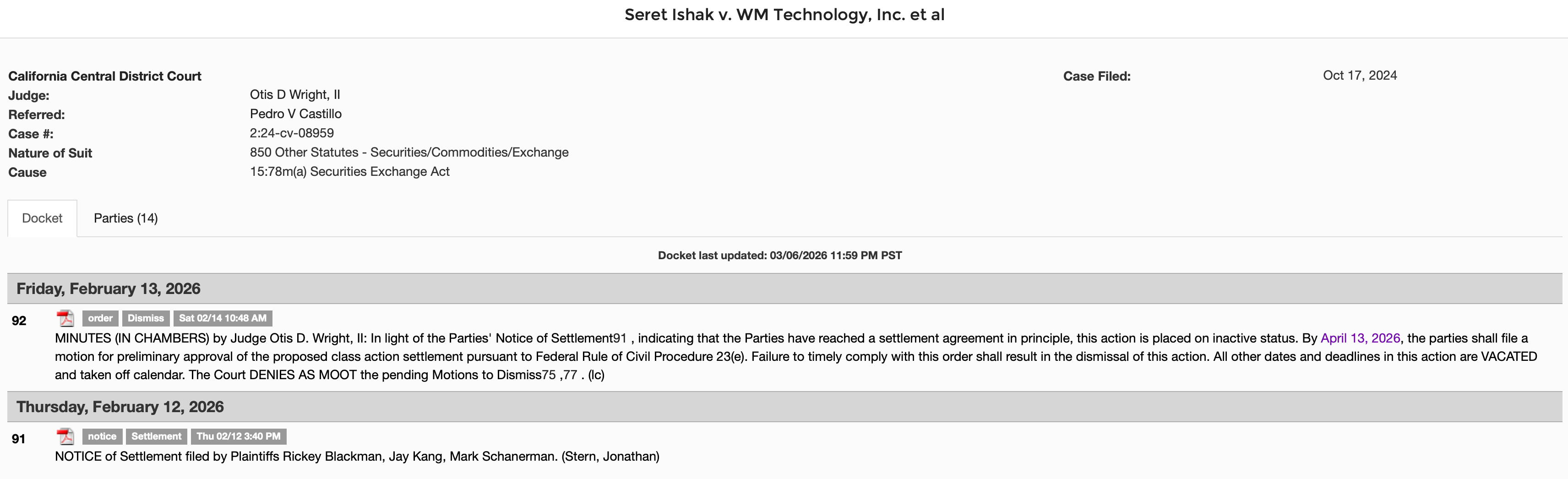 Preliminary approval motion is due April 13, 2026—that’s the next factual checkpoint. The consolidated derivative action (DeGennaro/Pearson v. Francis et al.) is a separate track, with that stay extended to April 10, 2026 to allow resolution discussions. Structurally, derivative claims assert harm on behalf of the Company. Net of D&O coverage and any litigation costs, any economic recovery would accrete back to the entity rather than dilute it. This is a governance and insurance matter, not an equity impairment event.